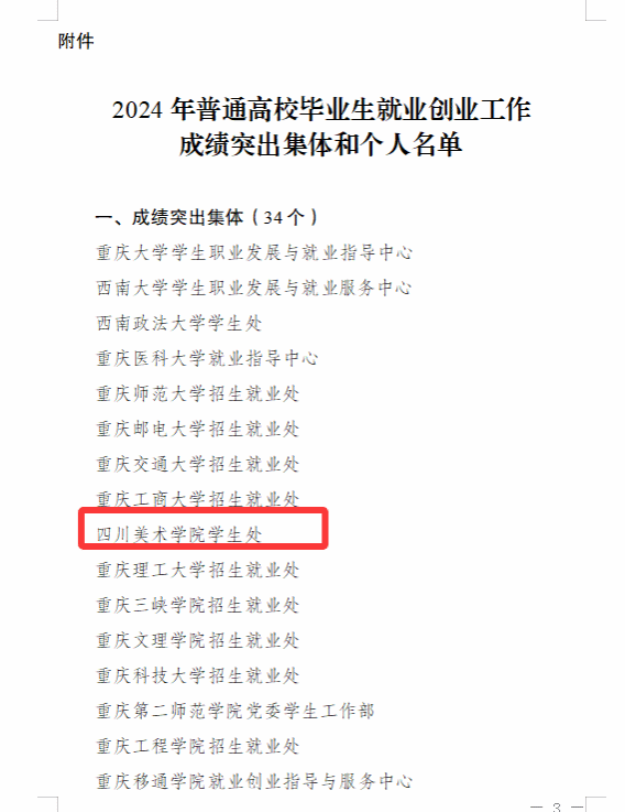 近日,重庆市教育委员会、重庆人力资源和社会保障局下发《关于表扬2024年普通高校毕业生就业创业工作成绩突出集体和个人的通报》(渝教学函〔2025〕11号),对2024年重庆市普通高校毕业生就业创业工作成绩突出集体和个人进行了表彰。