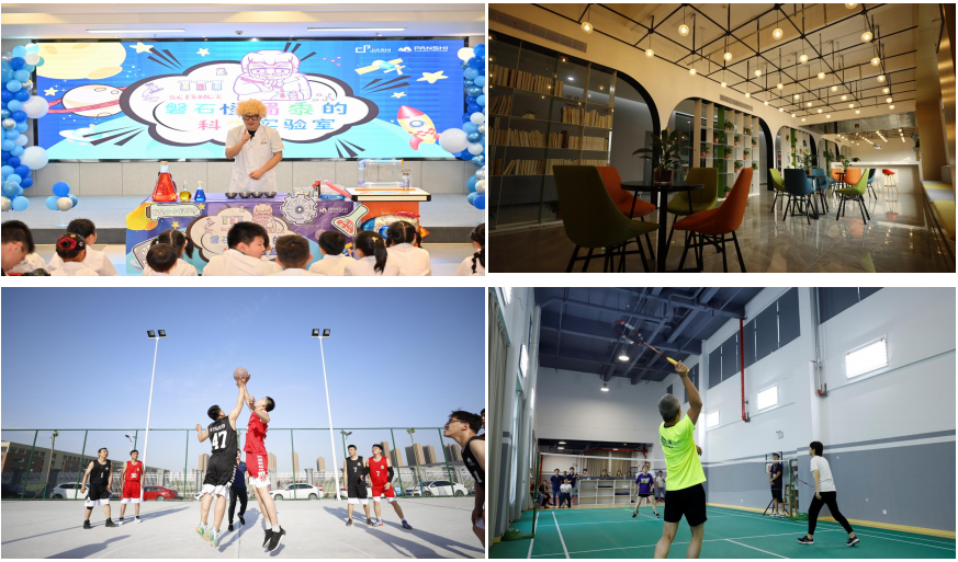 室内乒乓球室、室内羽毛球室、健身房、室内桌球室、图书馆、篮球场、茶吧、食堂、