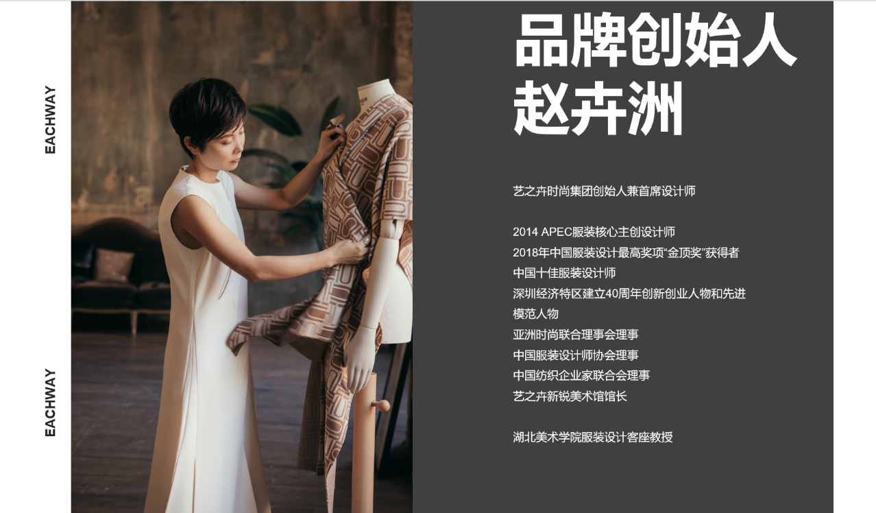 EACHWAY(艺之卉)时尚集团,创立于1997年,注册资本5000万,秉承用设计改变生活的理念,是一家以服装服饰产业、现代传媒产业及创意产业三大产业为支柱的大型国际化时尚集团,旗下拥有著名女装设计师品牌艺之卉EACHWAY、意大利高端女装品牌HUI以及意大利时尚艺术生活方式类品牌SOFA。经过二十余年的发展,集团建设了深圳市龙华区的艺之卉创意产业园和惠州市惠阳区的艺之卉时尚科技城;为了提高现代传媒传播的效率,增设深圳市艺之卉百年时尚博物馆、新锐美术馆、鱼文化馆、服装设计研究院和时尚产业研究院等IP。目前EACHWAY(艺之卉)时尚集团已发展成为成为中国最具实力的时尚企业之一、连续9次登上米兰国际时装周的中国女装品牌。