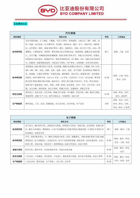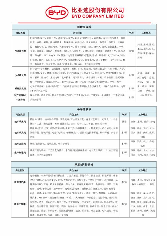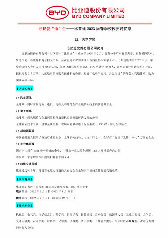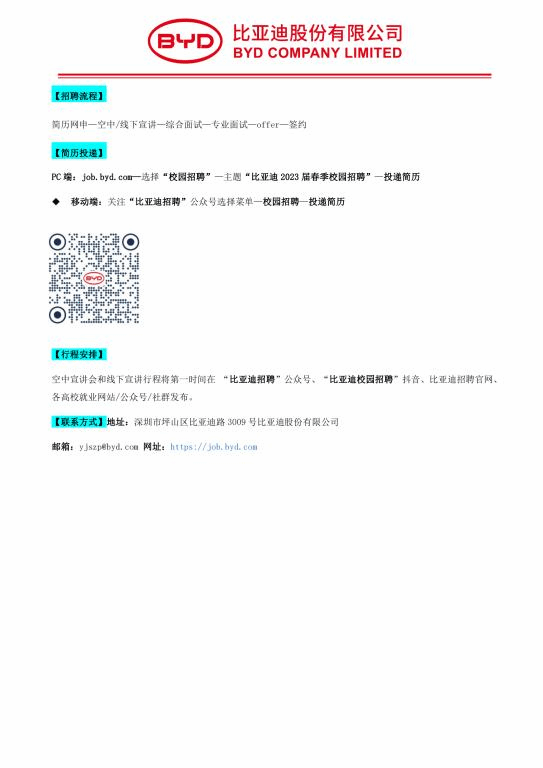 比亚迪2023届春季校园招聘简章