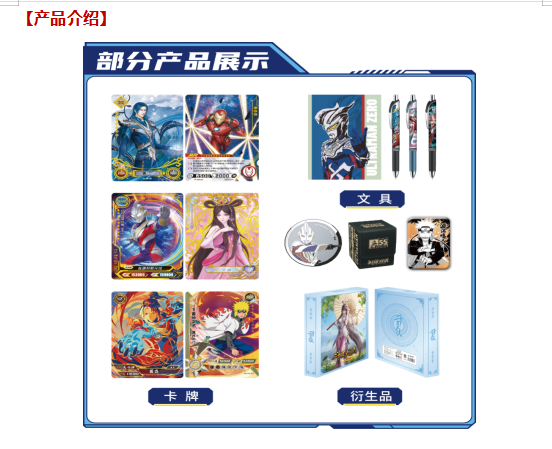 卡游动漫始终秉持“分享快乐,传递正能量”的品牌理念和“厚道·善学”的价值观,先后与国内外50多个知名IP深入合作,开发出“英雄对决”等卡牌类产品系列,突破了娱乐工具和纸质收藏品属性,升华为培养青少年社交能力的专属介质,为动漫爱好群体提供高品质、多玩法、健康向上的动漫衍生产品。