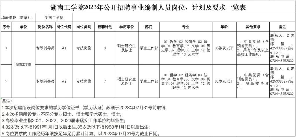 附件:1.湖南工学院2023年公开招聘事业编制人员岗位、计划及要求一览表