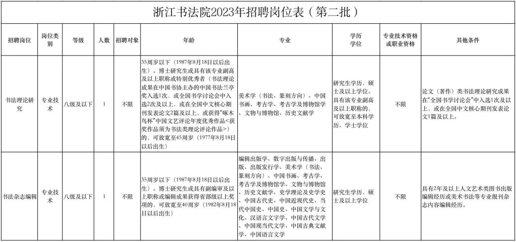 本次招聘需求为2个岗位2人,分别为书法理论研究岗位1人,书法杂志编辑岗位1人。具体岗位要求见公开招聘岗位表(附件1)。