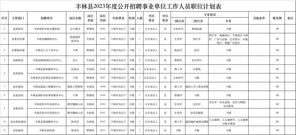 2.招聘岗位人数与通过资格审查的报名人数之比应不低于1:3的比例,若达不到该比例,经丰林县事业单位公开招聘工作领导小组同意,可减少该岗位的招聘人数或者取消该岗位的招聘,并在丰林县人民政府网站、丰林人社公众号公布。原报考岗位被取消的,应聘人员可在规定时间内改报其他符合报名条件的岗位,只能改报1次。