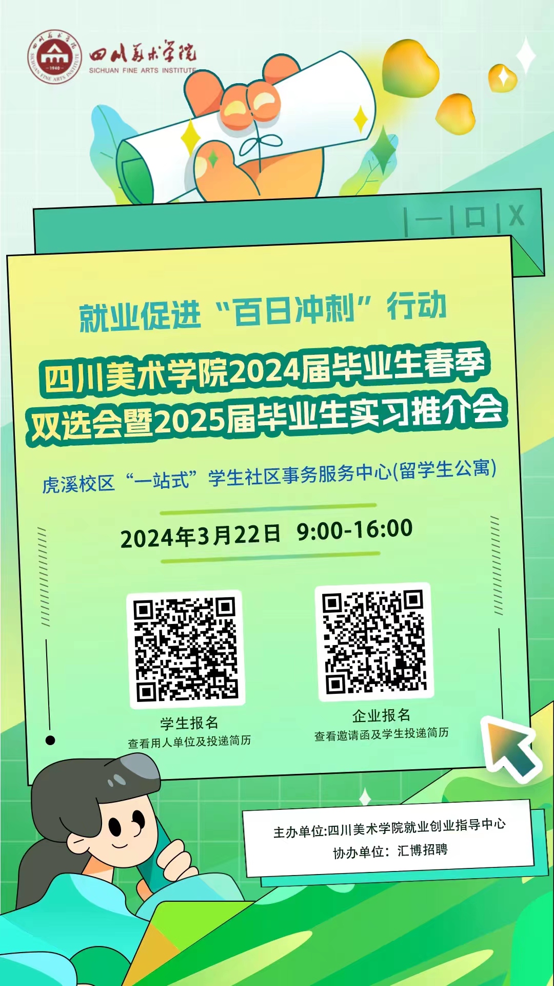 衷心感谢贵单位对 毕业生就业工作的关心与支持!为搭建用人单位和我校毕业生便捷、高效的供需平台,促进毕业生高质量充分就业,我校拟举办就业促进“百日冲刺”行动—— 2024届毕业生春季双选会暨2025届毕业生实习推介会。我们诚挚邀请校友企业积极参加,选聘川美优秀毕业生!现将本次活动有关事项函告如下: