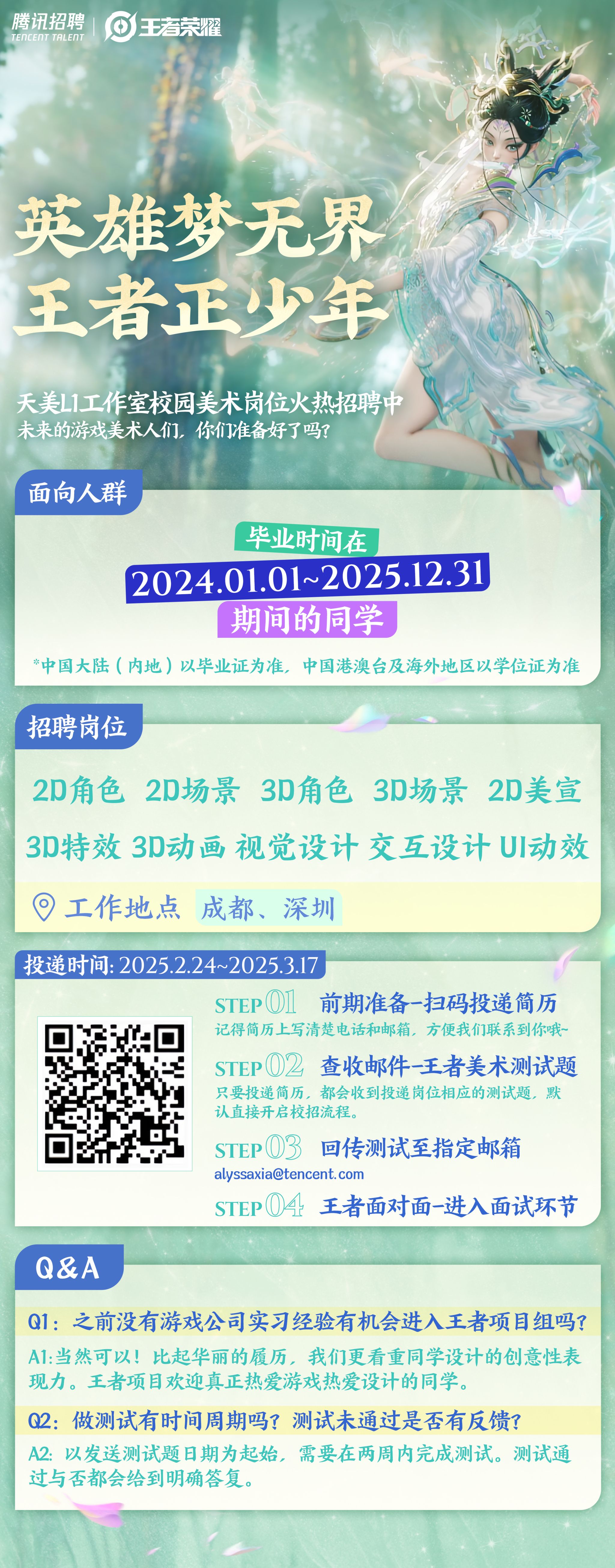 天美L1工作室游戏美术岗位的校招补录正式开始啦!