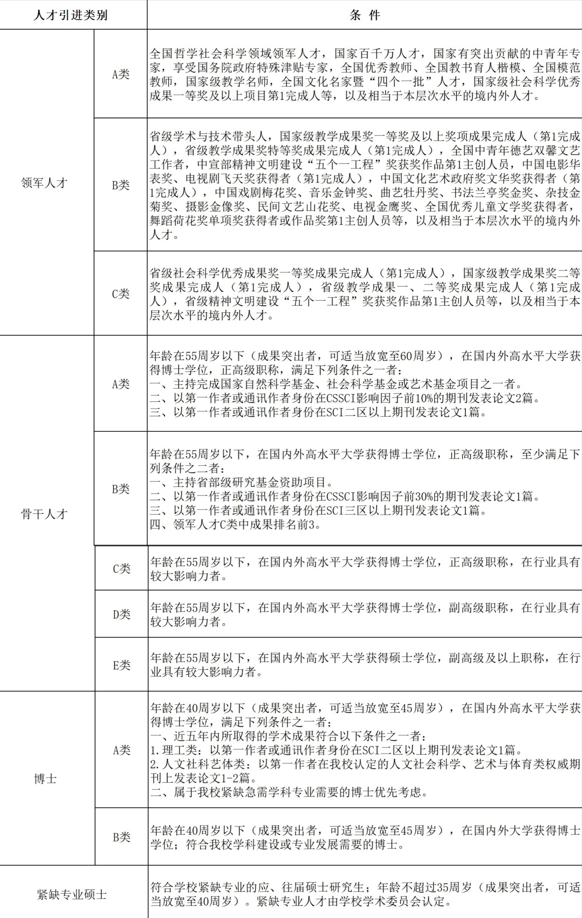 (一)人才引进类别及条件