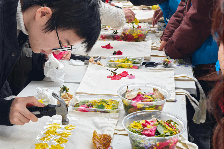 此外,志愿者立足专业开展植物拓印活动,通过传统植物拓印技艺,将自然植物纹理定格于帆布包上,并赠予校园劳动人员,以艺术创作传递感恩与关怀。志愿者们以高新区“3.5学雷锋”志愿服务主题实践为契机,参加创意志愿服务集市,展示我校志愿服务成果,向社区老人赠送拓印作品,深化“校内实践+校外展示”联动机制。