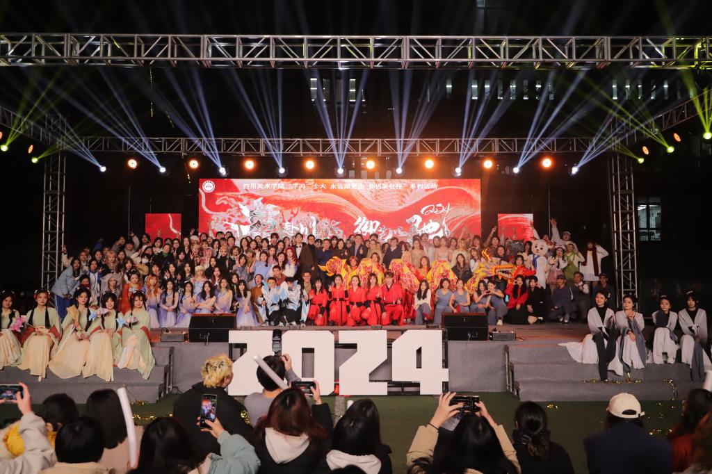 2024年“龙赴川海 御艺以驰”元旦晚会于虎溪校区操场举行。学校党政主要领导通过视频向全校师生表达新年祝福。近2000名师生到现场观看节目。