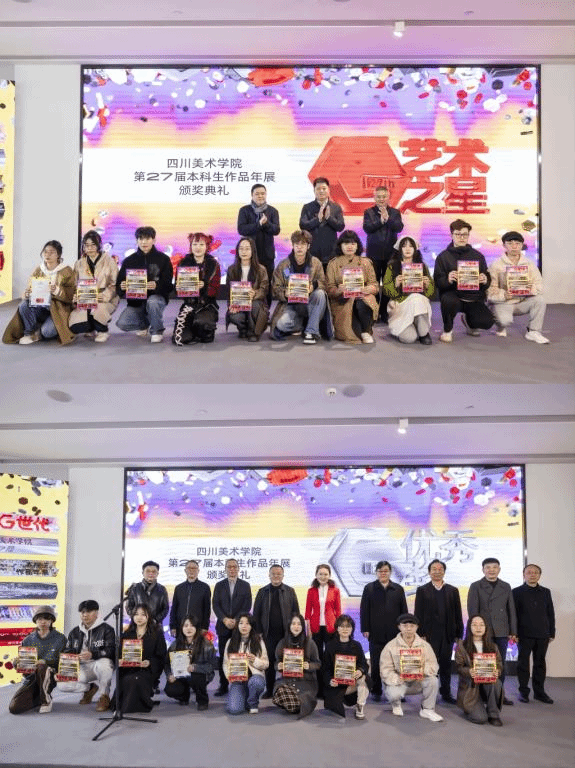 此次年展共计展出作品212件,来自9个学院30多个专业,涵盖绘画、雕塑、设计、工艺等多种表现形式。经校内评审专家及校外特邀评审专家评审,最终评出“优秀作品”59件,“艺术之星”10件。学校党委常委、副院长段胜峰,党委副书记左益分别宣读了 第27届本科生作品年展“优秀奖”以及“艺术之星”获奖名单,出席开幕式的领导和特邀嘉宾为获奖学生代表颁奖并合影留念。