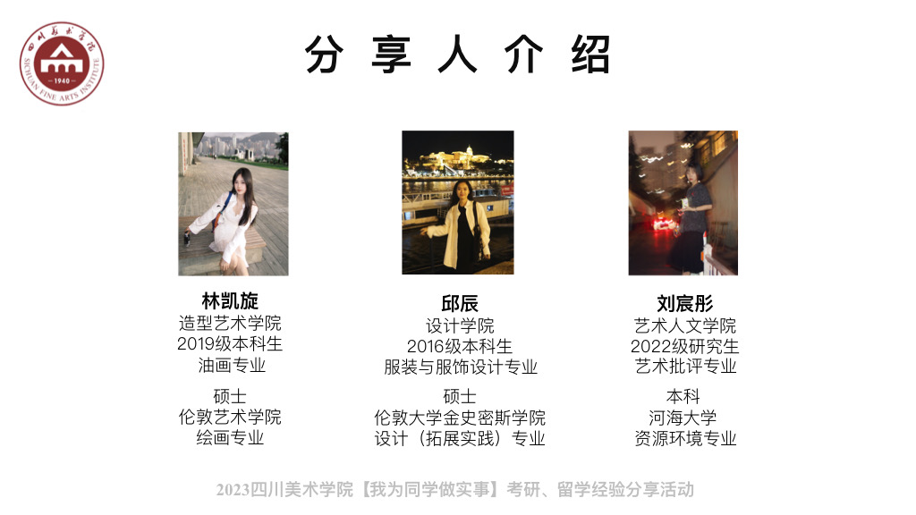 本次分享会邀请到造型艺术学院2019级毕业生林凯旋、设计学院2016级毕业生邱辰、艺术人文学院2022级研究生刘宸彤作为分享嘉宾,就出国留学、升学考研等方面进行分享。