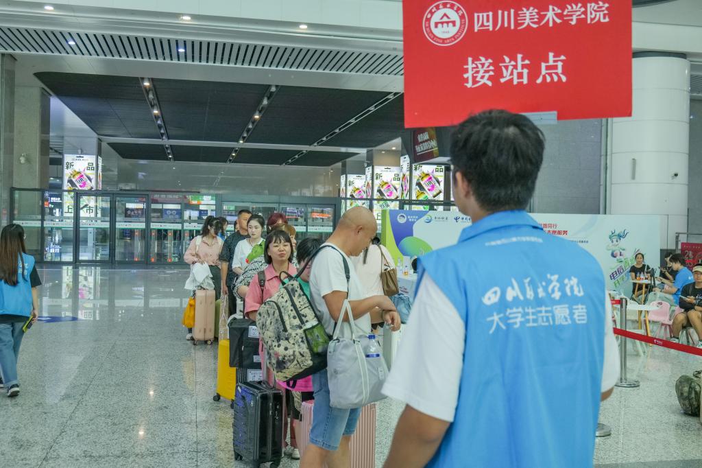 在火车西站,志愿者们早早来到出站口等候,他们佩戴着志愿者工牌、身穿蓝马甲,以热情的引导与暖心的微笑,迎接每一位远道而来的新生。志愿者们按照车次到站情况等候新生,有序组织新生与家长寄存行李、驻足休息,不时与同学们亲切交流,为其答疑解惑。