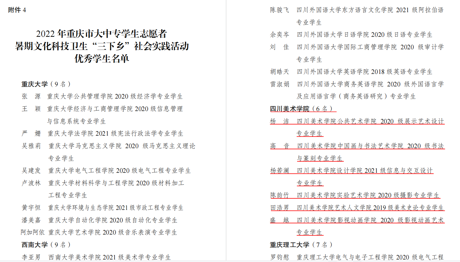 近日,在重庆市2022年大中专学生志愿者暑期文化科技卫生“三下乡”社会实践活动评比中,我校荣获13项表彰。其中,学校团委获得“优秀单位”称号,迄今为止,我校已连续19年获此荣誉;校团委“稚童道合绘初心”党史学习教育团、建筑与环境艺术学院“逐梦乡间”小分队、设计学院“喜迎二十大 相约金丝楠”川美设计理论宣讲团、影视动画学院“美丽乡村 艺梦同行”乡村振兴实践团共计4支团队获得“优秀团队”称号;公共艺术学院团总支书记许冠、艺术教育学院团总支书记邱千千获得“先进工作者”称号;杨洁、高音、杨若澜、陈韵竹、田浩男、盛越6名同学获得“优秀个人”称号。