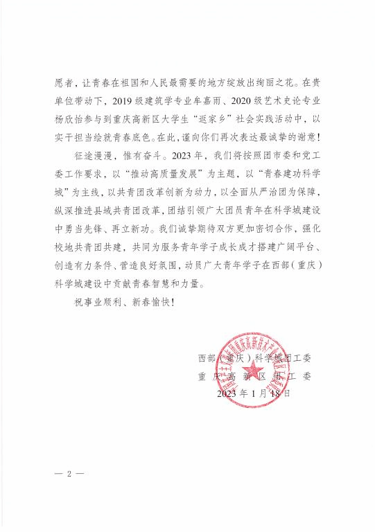 近日,西部(重庆)科学城团工委、高新区团工委向我校团委发来感谢信,对我校团委长期以来关心支持高新区共青团工作,在大学生志愿服务西部计划、“三下乡”社会实践、大学生“返家乡”社会实践等品牌项目中的支持表示衷心感谢。2022年,学校为高新区输送了胡广才、韩宇两名西部计划志愿者,让青春在祖国和人民最需要的地方绽放绚丽之花;动员牟嘉雨、杨欣怡两位同学参与到高新区大学生“返家乡”社会实践活动中,以实干担当绘就青春底色。