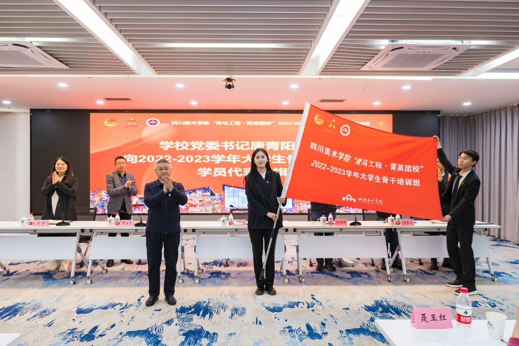 开班仪式上,唐青阳向2022-2023学年大学生骨干培训班授予旗帜。