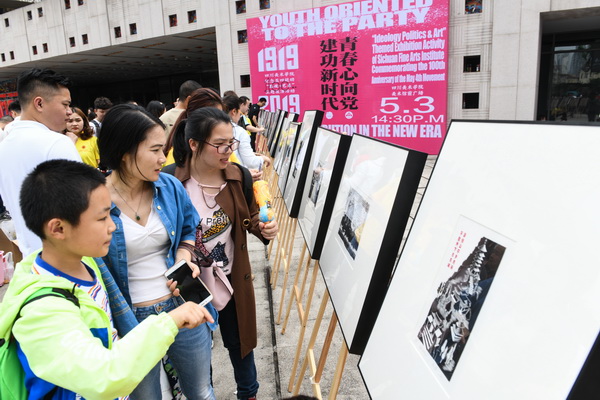 开幕式结束后,在场领导嘉宾一同观看了“思政+艺术”主题展演活动,并参与相关活动体验。展演活动分为4个版块。“青春心向党 版画绘长江”主题版画创作展览板块以习近平总书记视察重庆重要讲话精神,习近平总书记在五四运动100周年大会上重要讲话精神等为主题进行黑白木刻版画创作,并给广大群众提供印制版画的现场体验;“青春心向党 川美创意浓”川美创意市集板块荟萃了川美本土的创意力量,在川美这样一个厚植创业土壤的校园里,给青年创新创业划下第一道起跑线,是众多才华横溢的原创艺术家与设计师的事业起点;“青春心向党 五四百米绘”百米长卷绘板块全校各院系的优秀团员青年代表参与,在创作中回顾历史,品味历史,学习历史,画笔激昂青春志,奋斗成就少年梦;“青春心向党 颂歌献祖国”川美青年学子快闪唱团歌板块,广场前的大屏幕上播放的视频中摄录了川美怡人的校园景色,川美的油菜花海契合了“我们是五月的花海”这句歌词等;我们用“思政+艺术”这样的探索,展现川美青年立足中国土地,淬炼着自己的艺术、情操、胸怀,用独具川美特色的方式体现五四精神和时代精神。