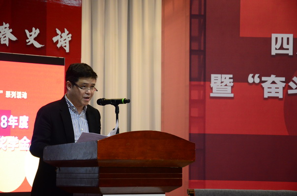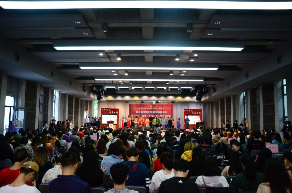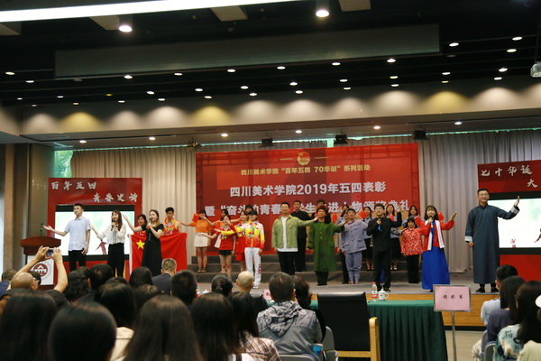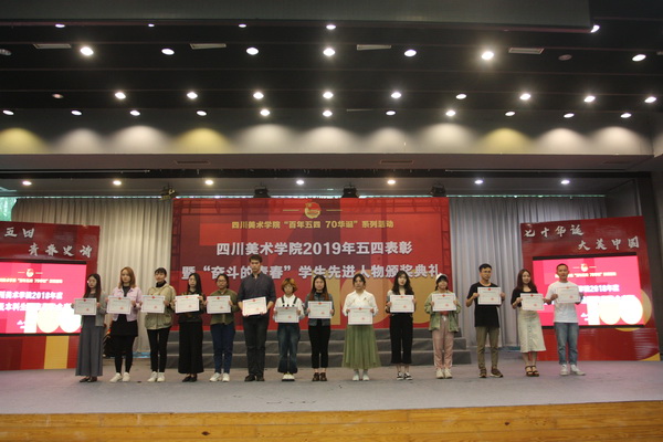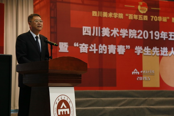 黄政作总结讲话。他首先代表学校党委向受到表彰的先进集体、个人表示热烈祝贺。向长期以来关心青年成长、致力于青年事业的同志们表示衷心的感谢。他讲到,今年是五四运动100周年。4月30日,我们收看了习近平总书记在纪念五四运动100周年大会上的重要讲话,总书记对新时代青年提出了树立远大理想,热爱伟大祖国,担当时代责任,勇于砥砺奋斗,练就过硬本领,锤炼品德修为的六点要求。学校广大青年要牢记总书记的嘱托,让青春在民族复兴奋斗中飞扬。学校在五四前后也举行了系列纪念活动,4月29日到红岩革命纪念馆开展特别主题团日活动,5月3日在学校举行“思政+艺术”主题展演活动,各院系也开展了丰富多彩的活动。今天我们又在这里隆重举行2019年五四表彰暨“奋斗的青春”学生先进人物颁奖典礼。刚刚看到同学们精心准备的节目,听到优秀同学和优秀集体的事迹分享,我倍感欣慰和振奋,奋斗的青年就在川美,就在我们的身边,我们要汲取榜样力量,与榜样同行,在实现中国梦的奋进中绽放青春光芒。