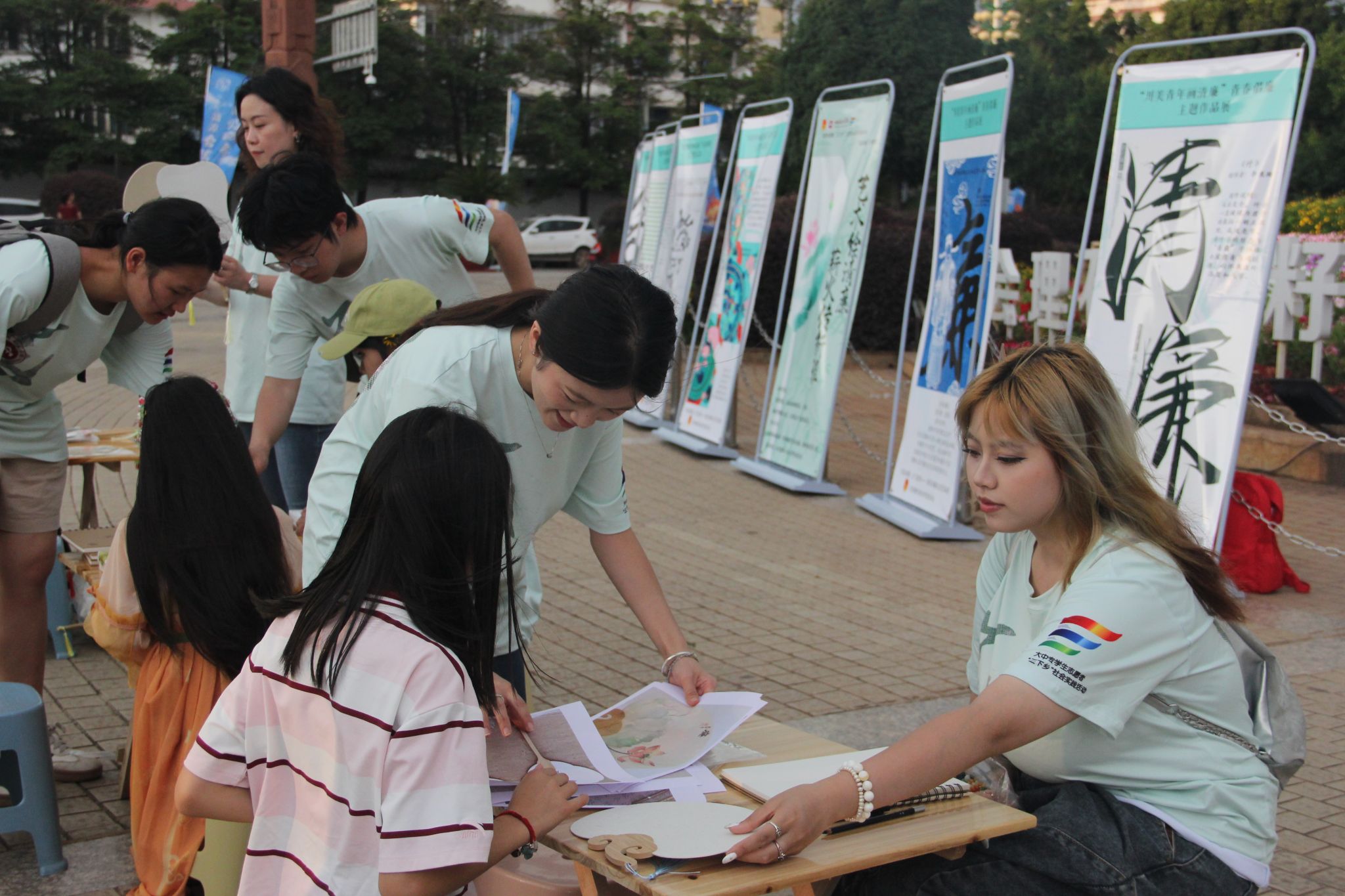在象征民族团结的石榴广场,实践团通过主题宣讲与互动创作形式将廉洁教育与艺术美育相结合。以书法、绘画、海报等多元艺术形式,生动阐释廉洁文化内涵,积极倡导尊廉、崇廉、学廉、守廉的社会风尚。师生与市民共同创作象征高洁的莲花,书写清风箴言,将爱国情怀与廉洁操守转化为可视可感的艺术风景,进一步拓宽了以艺术服务基层廉洁教育与爱国主义教育的思路视野。