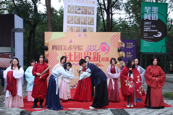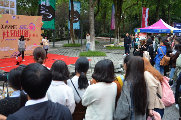为展示我校学生社团的风采,扩大学生社团的校园影响力,为学生社团的可持续发展注入新鲜血液,10月11日下午,由校团委主办、社团联合会承办的2017年 “团盈艺境”社团招新开幕式在学生食堂小广场举行,全面启动了为期三天的2017年学生社团招新活动。学校党委常委、副校长彭林权亲临活动现场,对学生社团的建设与发展提出了宝贵意见。