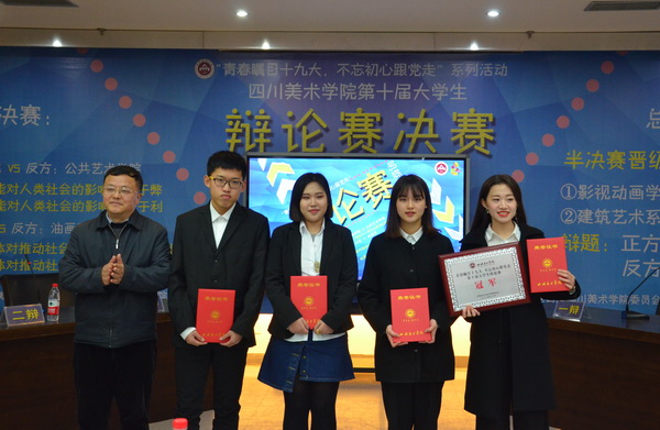 唇枪舌剑,论出青春之光。总决赛中,无论是开篇立论还是总结陈词,辩手们都妙语连珠,辩之有理,驳之有据。经过精彩辩论,公共艺术学院最终夺冠,油画系获得亚军,影视动画学院、建筑艺术系获得季军。油画系孙千淇获得最具风采奖,公共艺术学院初映含获得最佳辩手奖,国画系、手工艺术学院、设计艺术学院、新媒体艺术系获得优胜奖。左益副书记及决赛评委们为获奖院系及个人进行了颁奖。