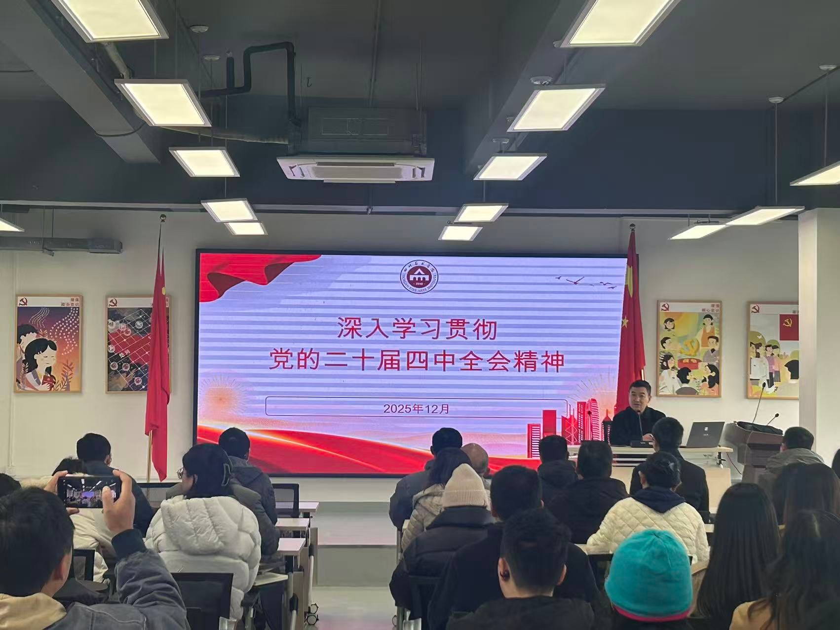 12月17日下午,学校党委常委、副院长王朝刚面向设计学院、建筑与环境艺术学院、人事处、党委保卫部、图书馆、信息中心等单位党员师生宣讲党的二十届四中全会精神。