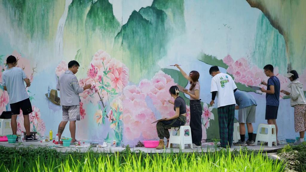 把文艺创造写到民族复兴的历史上、写在人民奋斗的征程中。7月11日当晚,影视动画学院师生就发挥在专业优势和功底,展开共计200平方米的精美艺术墙绘方案的策划创作,将中心村中诗情画意般的村庄要塞地点的斑驳陈旧墙面变成一幅巨幅美术馆级别的精美作品,并与自然风光和谐统一的打造成了“旅拍打卡点”,为世外桃花源景点中心村打造驴行大本营奠定视觉元素基础,为前往盖上草原徒步的驴友提供整顿休息的场所,把艺术创作写在大地上,通过吸引村外人流进村,推动中心村民俗手工艺产业、农副产品和民宿产业发展。绿水青山就是金山银山,重庆酉阳土家族苗族自治县花田乡中心村拥有绿水青山也就是拥有了金山银山,既要保护生态环境,也要通过经济发展源源不断创造综合效益,实现村子的可持续发展,主题墙绘是一条线,串联起了中心村这个“世外桃源”和村外想要进入这个“世外桃源”的人们,将稀有的真正原生态的绿水青山发展成村民的金山银山和创收致富之路。另一方面,主题墙绘将艺术的美播种在村民的心中,虽然村子中主要是老年人和留守儿童,但是他们对美好生活的不懈追求、为改变命运的不屈奋斗是一致的,美育教育就是以艺通心,以艺凝心,以艺净心,增强村民的文化自信,驱动他们振兴乡村的“原动力”,让他们都加入到乡村建设的队伍中来,贡献乡村振兴的汗水,享受乡村振兴的丰硕成果。
