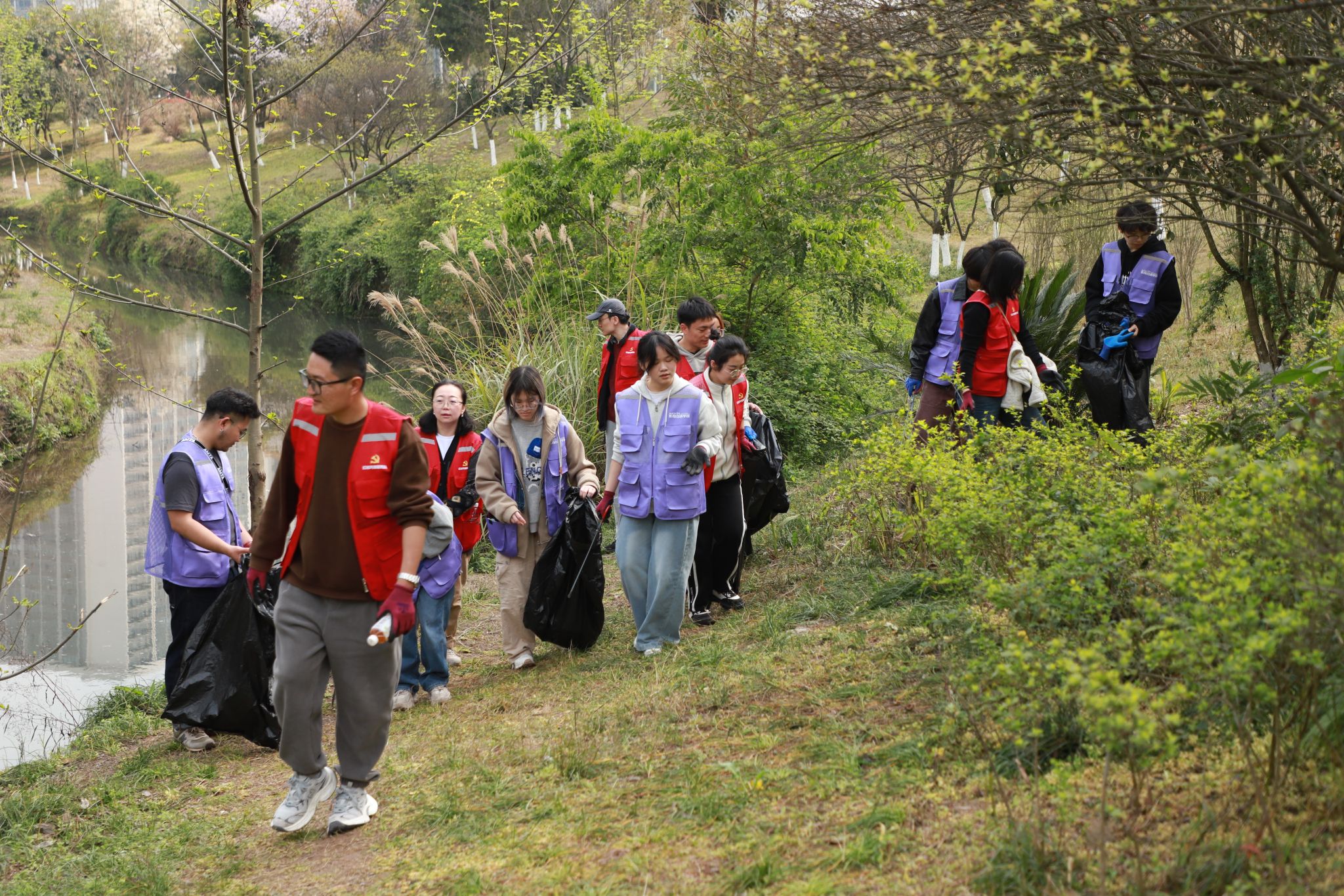 然后,服务队前往虎溪河青年广场段及周边开展白色垃圾清理,弘扬新时代雷锋精神。队员们分组对河道及其周边开展“地毯式”清理,大家手持铁钳、垃圾袋等工具,重点清理河道两岸的生活垃圾、塑料废弃物、烟头等,让河道更整洁,环境更美好。