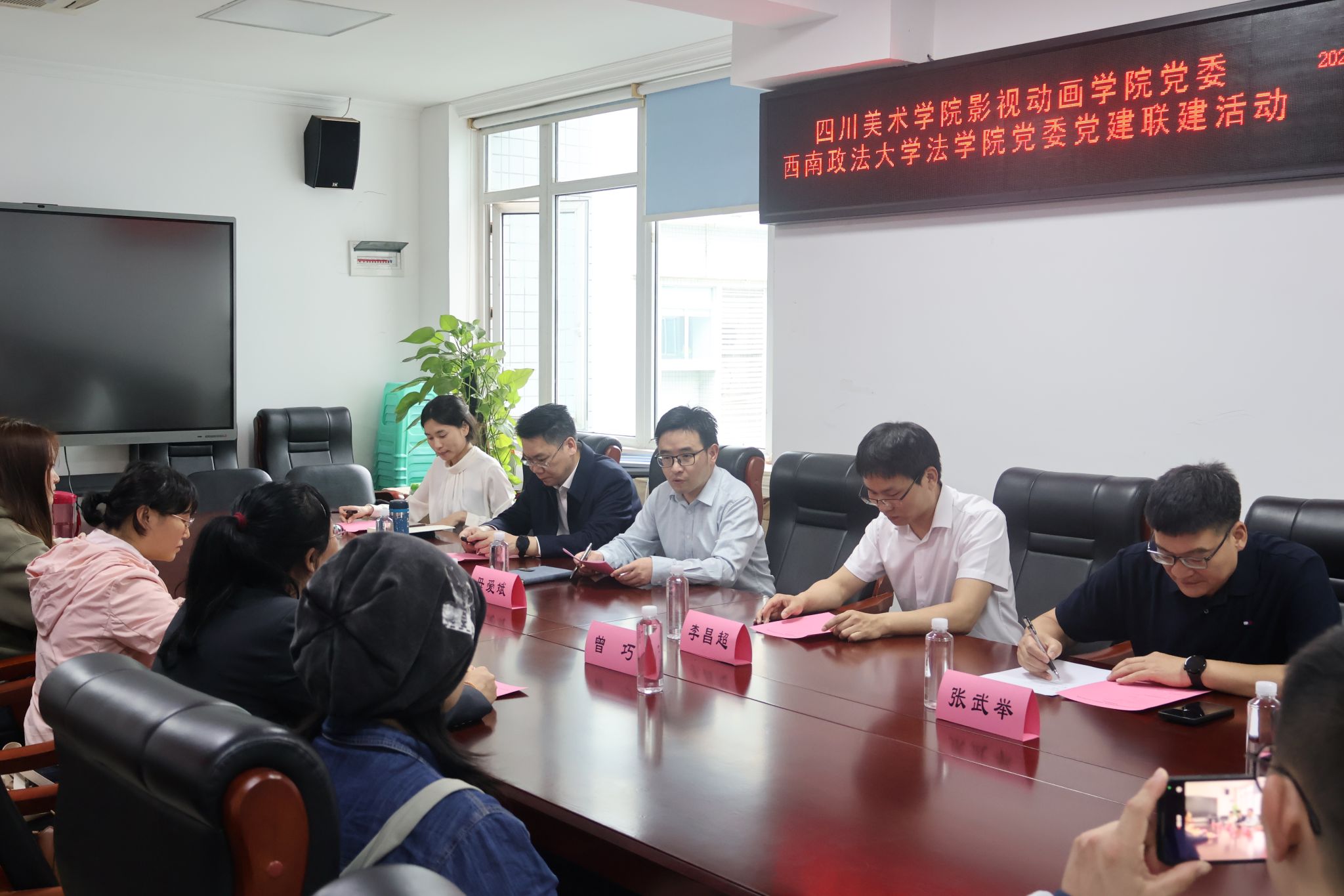活动现场,西南政法大学法学院毋爱斌副院长主持活动并致欢迎词,并详细介绍了法学院党建工作发展的近况以及历年来取得的成就。 影视动画学院党委副书记曾巧教授,详细介绍了学院“艺术+党建”融合模式的创新实践。接下来两个国家样板支部书记分别介绍了一年来支部建设情况,西南政法大学法学院民事诉讼法教研室支部书记李昌超以一系列鲜活且具有代表性的公益法律咨询案例为切入点,生动阐述了法学院在服务社会、践行法治精神方面的积极探索与担当作为;影视动画学院研究生党支部书记刁颖则分享了通过影视动画专业优势开展红色文化传播、党员教育品牌化建设的经验。接着双方人员以学生与老师的党员结构、“法治+党建”的特色发展路径、“艺术+思政”专业特色融入党建工作、提升党员教育实效性等核心问题展开讨论,并就未来在党建课题研究、品牌活动共建、党员实践平台搭建等方面达成初步合作意向。