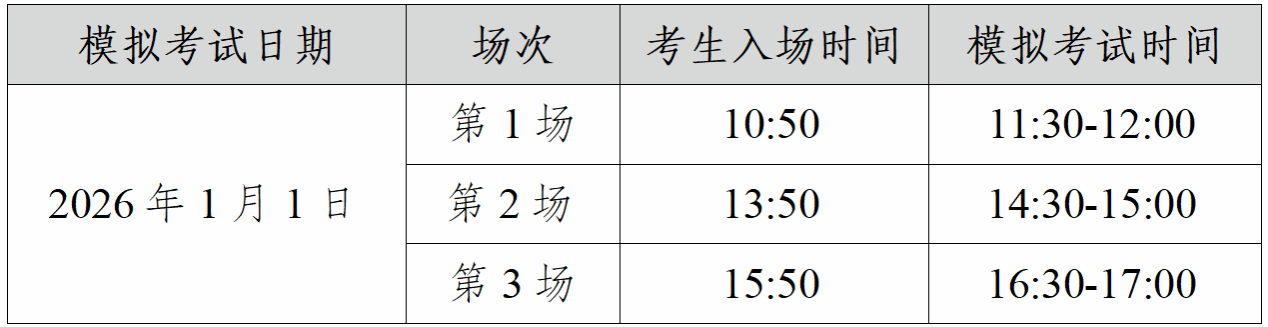 在线测试在2025年12月31日12:30-18:30进行,每位考生须在准考证上规定的两个在线测试场次中,至少选择一场进行测试,熟悉考试流程,在线测试场次及时间安排如下: