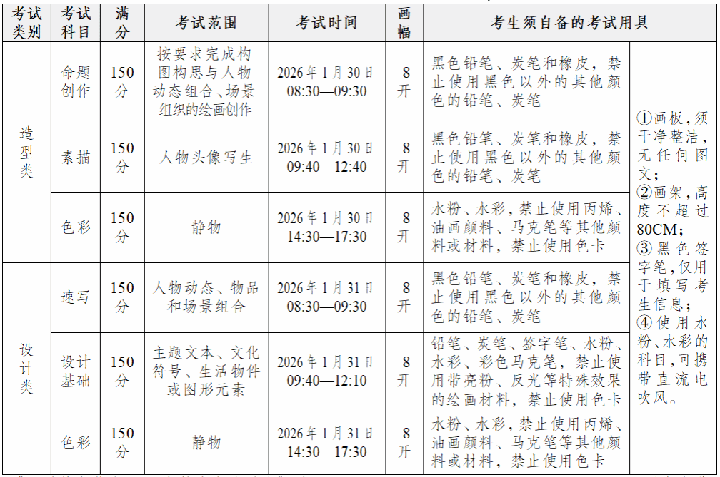 特别提醒:“设计基础”科目请考生携带具有长度标刻的直尺(尺面不带图形,长度不超多40cm)参加考试;使用水粉、水彩的科目考生可携带直流电吹风机。