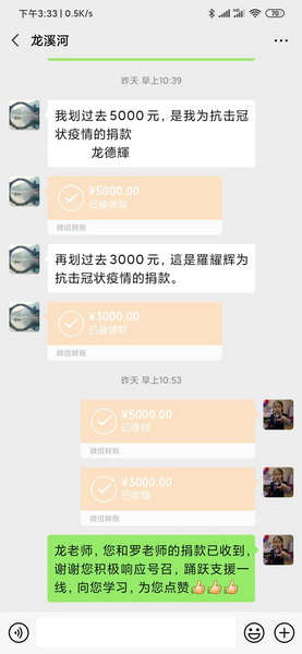 学校离退休老同志获悉这一消息后,积极响应,立即行动,慷慨解囊,踊跃捐款。86岁高龄的学校原党委书记高智科不会使用微信转账,专程到银行取出现金捐献5000元,并告知工作人员这是一名老党员的义务,国家有难,匹夫有责。龙德辉老教授自己带头捐献5000元,带动家属捐款3000元。老党员刘晓云捐款4000元。普通退休党员樊秀珍平时省吃俭用,这次却毫不犹豫地捐款2000元。年逾百岁的刘国枢老先生也托人转来捐款,表达自己对一线疫情防控工作的支持。在外地养病、年逾90岁的退休老党员、老教授李大树不会使用微信,辗转数次通过亲戚转来捐款。离退休老领导、老教授、老专家、教职员工都积极参与到捐款活动中,离退休老同志工作群微信转账的提示音、询问捐款信息的电话声一直不断。老同志们用实际行动表达同一个心声,虽然我们不能亲自参加一线的疫情防控阻击战,但是我们可以支援前线,相信这一份份爱心必将汇合成磅礴的力量,给前线战士带来积极的鼓励和坚强的支援。