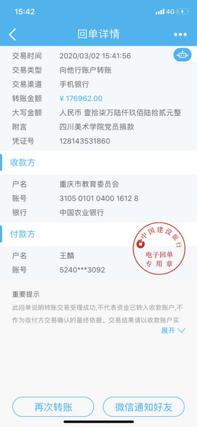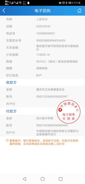 “守望相助、共克时艰”。在学校组织的捐款时间截止后,还陆续有党员、普通教职工仍积极捐款。学校于3月2日将全部爱心捐款通过两个渠道捐出:一是按照市委教育工委《关于组织党员自愿捐款支持新冠肺炎疫情防控工作的通知》要求,将461名党员捐款176962元上缴重庆市教育委员会账户,再由市委教育工委统一上缴市委组织部,支持疫情防控工作;二是将418名其他教职工捐款116852.18元捐赠给重庆市卫生健康委员会,用于本次新型冠状病毒感染的肺炎防控工作。