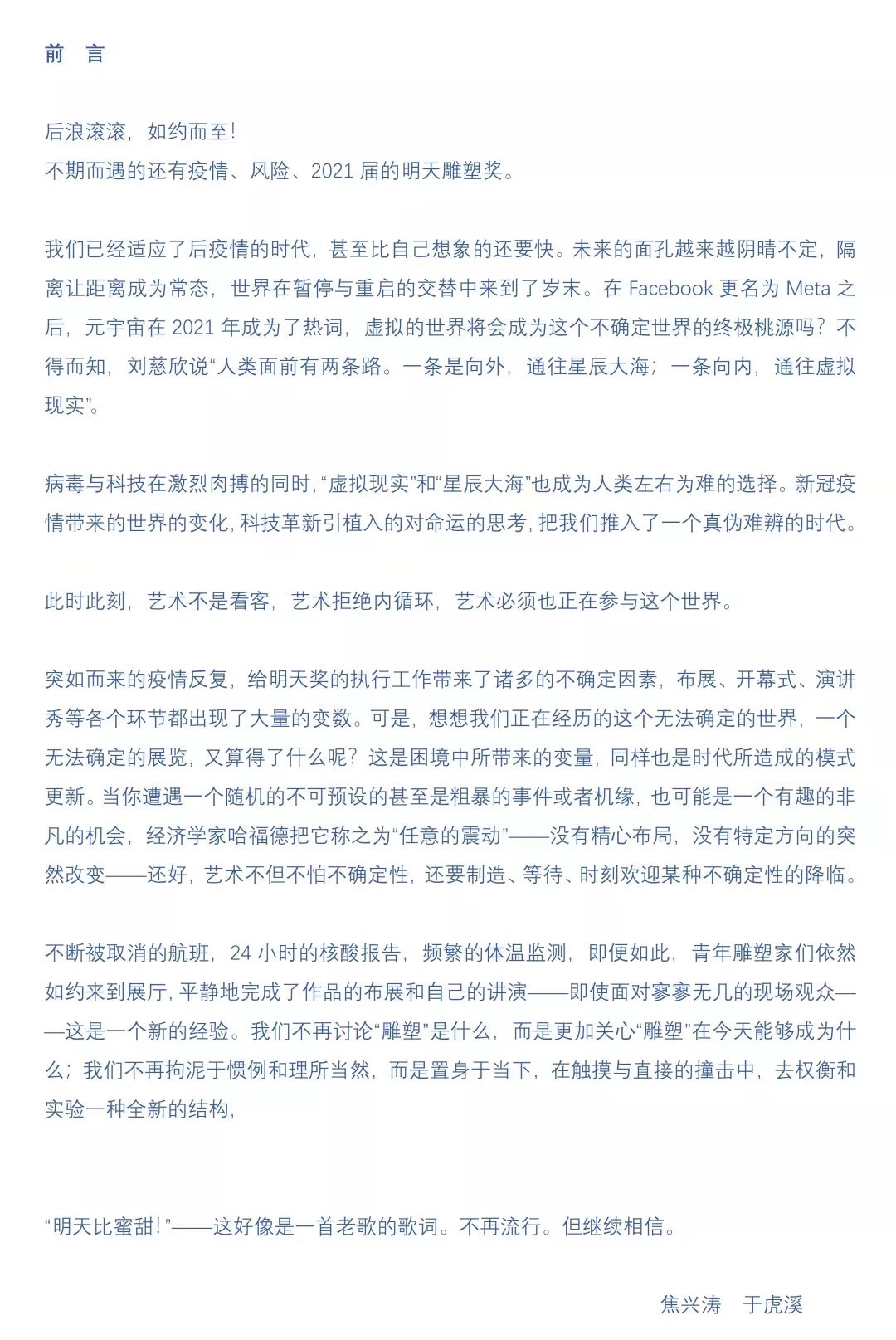 “明天雕塑奖”创立于2013年,由 、四川明天文化艺术投资管理有限公司联合主办,五粮液集团独家支持。自创立以来,本奖项持续关注和推介雕塑创作领域最具原创力和问题意识的作品与艺术家,坚持立足于中国文化语境的文明互鉴,以“雕塑+”的视域,呈现雕塑本体语言与拓展性建构的张力关系,提倡从观念、材料、跨媒介等多种方式应对日益复杂交融的艺术现实和社会现实。